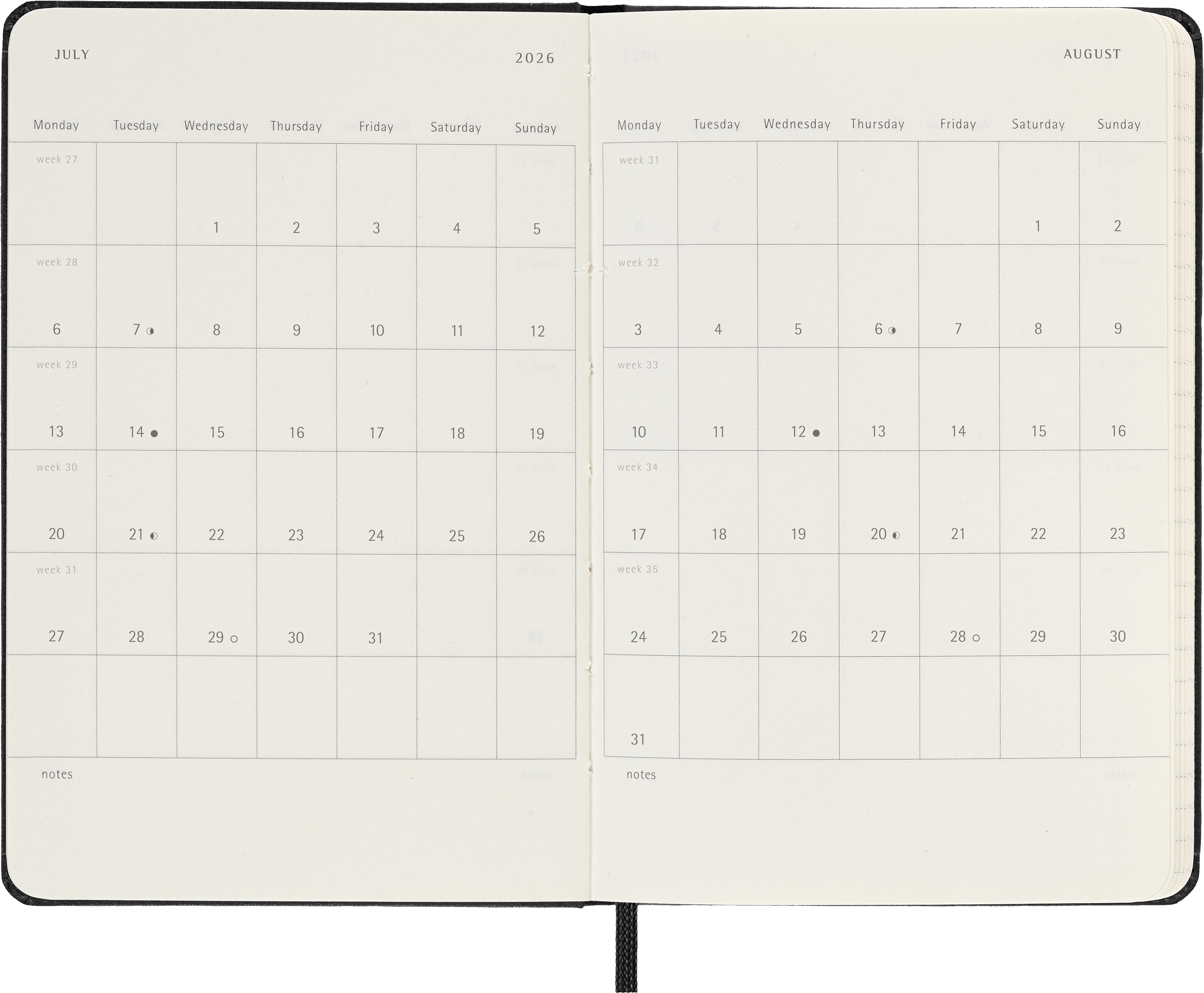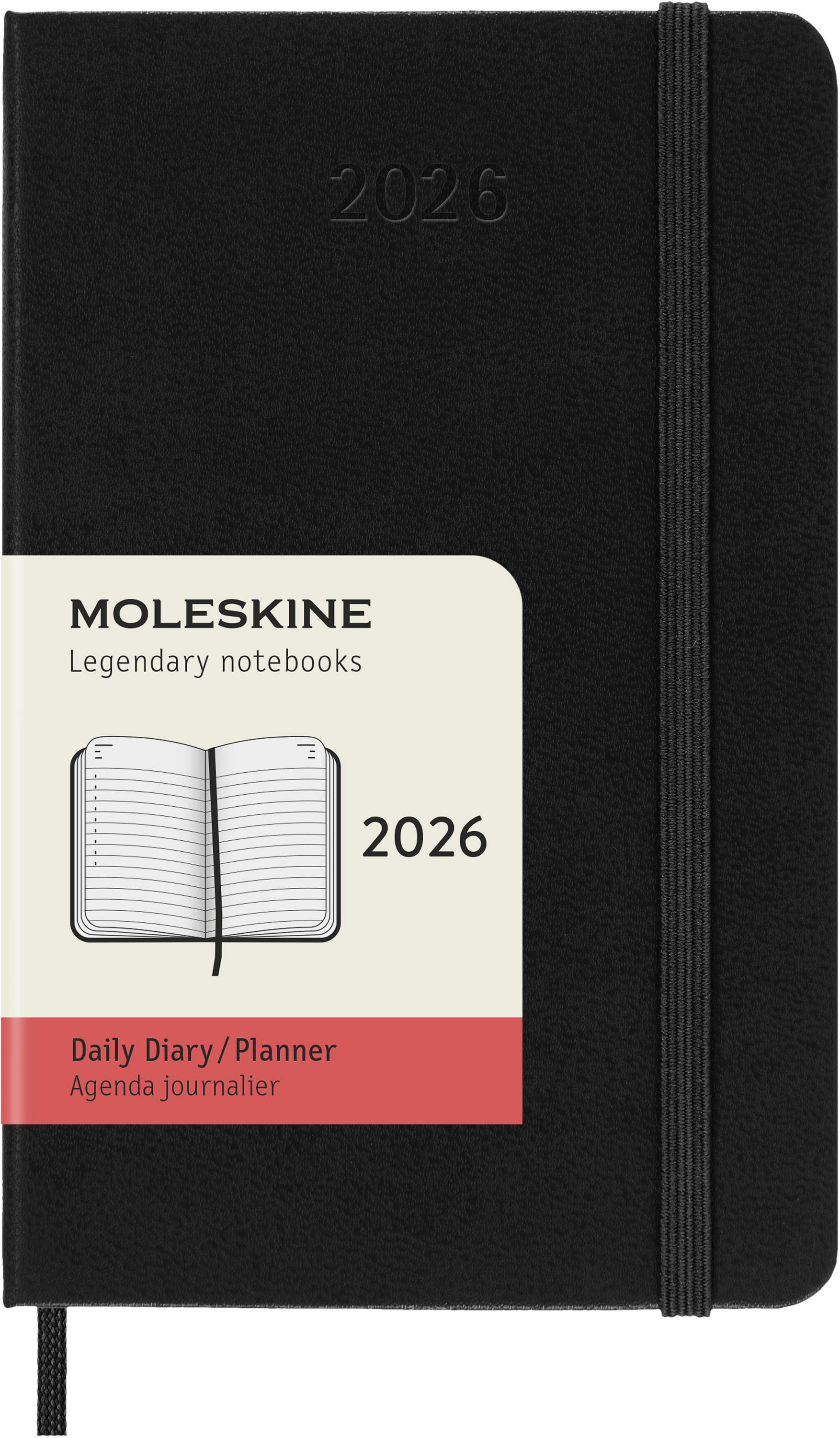 Moleskine 2026 dag pr opslag kalender i Pocket (A6+) størrelse med hardcover i Sort. Kalenderen dækker 12 måneder Januar til December, og giver dig et struktureret overblik over hele året. Designet med Moleskines klassiske detaljer som elastiklukning, runde hjørner, matchende bogmærkebånd, inderlomme til løse notater, stickers samt 70g elfenbensfarvet syrefrit papir, årsoversigt, månedsoversigt, hvilket gør den både praktisk og stilfuld. Perfekt til dig, der ønsker at holde styr på aftaler, deadlines og daglige noter med et professionelt og tidløst udtryk. En ideel kalender til både arbejde, studie og privat brug.