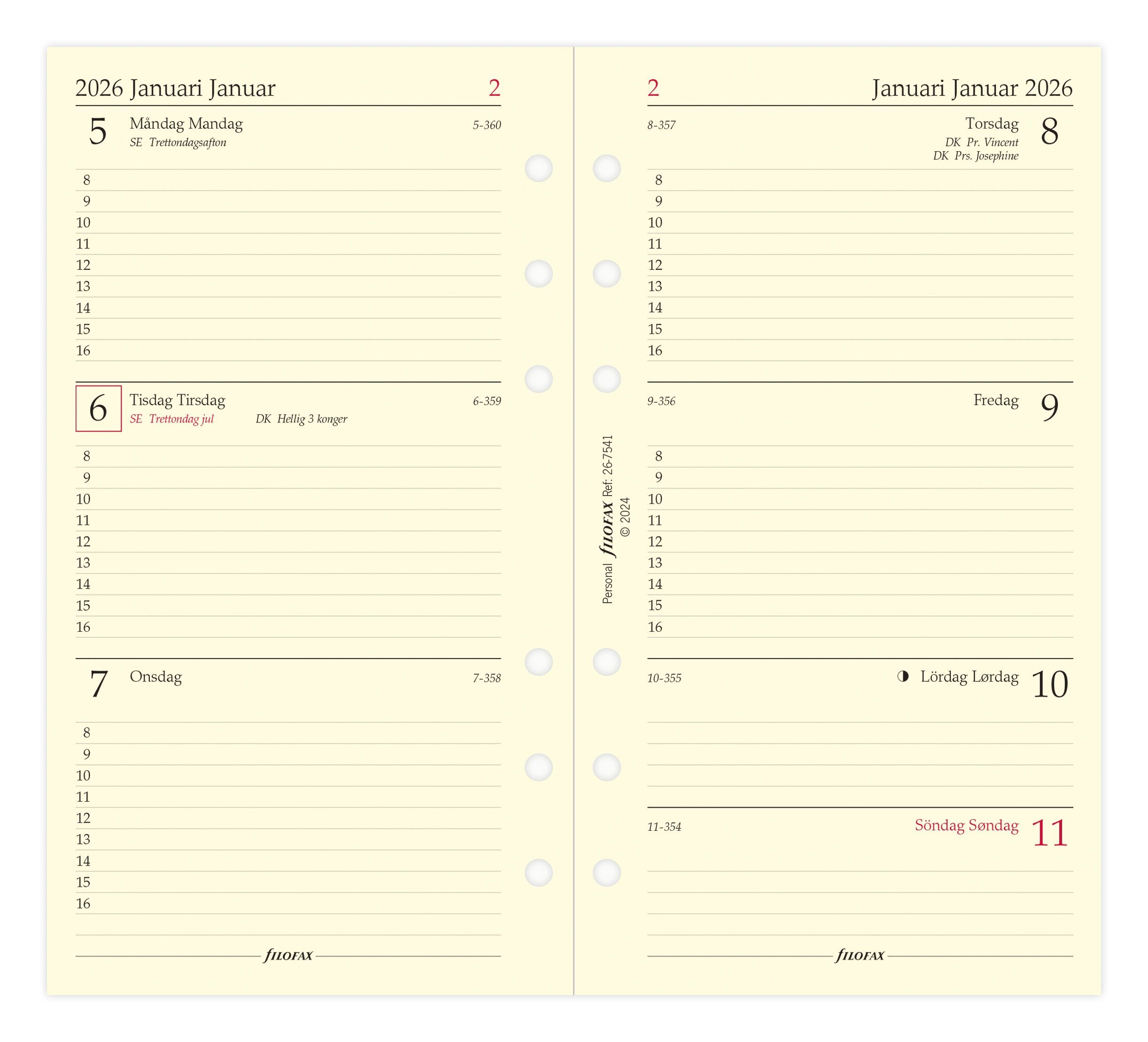 Derudover inkluderer Filofax Årspakke 2026 Personal en komplet kalender med ugeopslag, der præsenterer en uge på to sider. Dette giver dig rigelig plads til at planlægge hver dag i detaljer og skrive ned vigtige aftaler, opgaver og personlige noter.