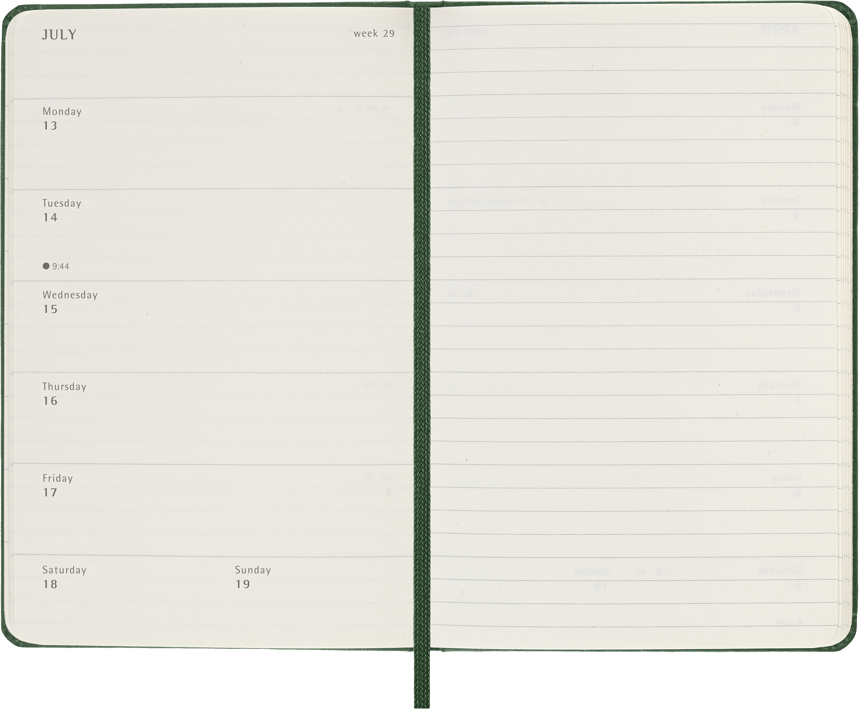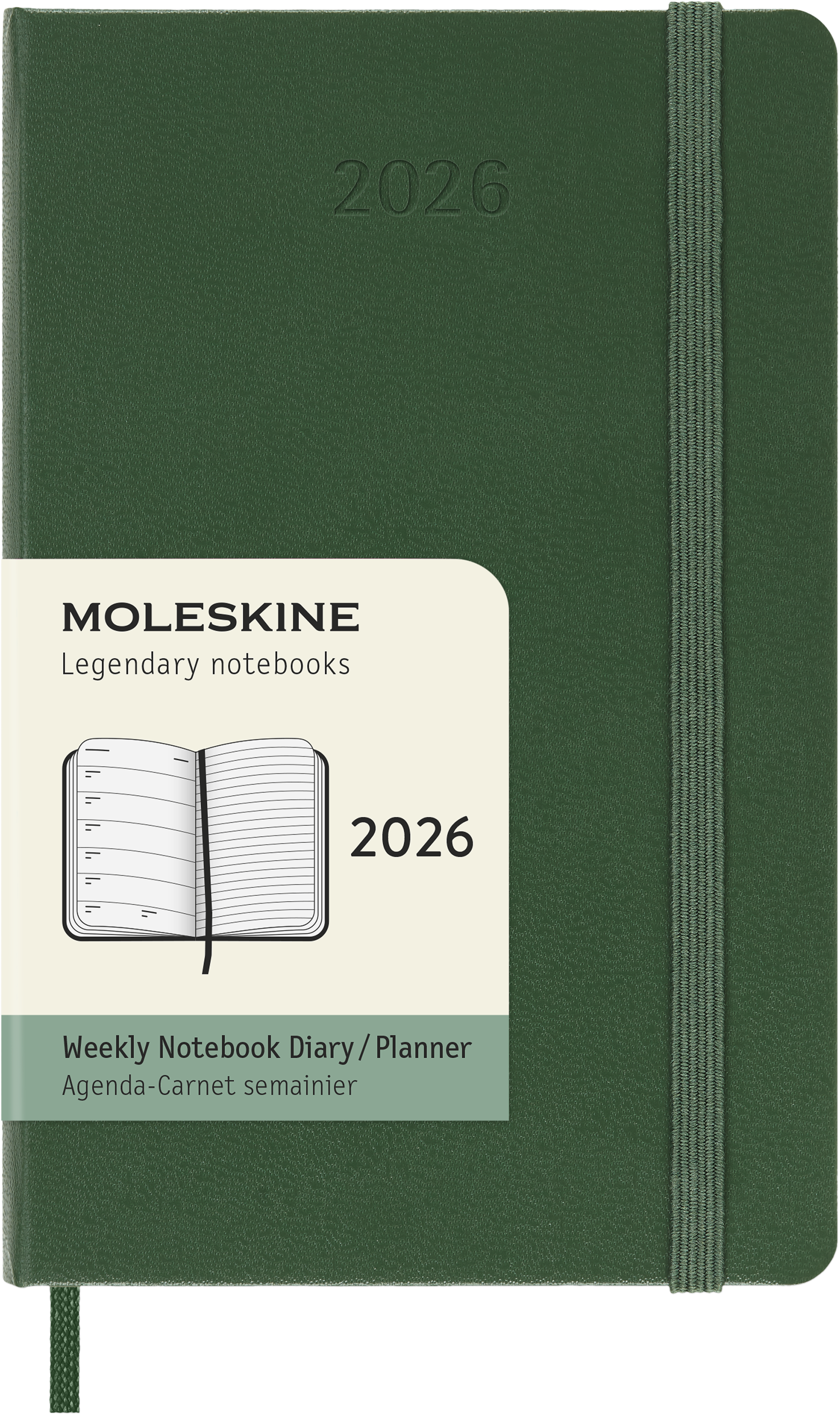 Moleskine 2026 uge pr side + notes kalender i Pocket (A6+) størrelse med hardcover i Myrtle Green. Kalenderen dækker 12 måneder Januar til December, og giver dig et struktureret overblik over hele året. Designet med Moleskines klassiske detaljer som elastiklukning, runde hjørner, matchende bogmærkebånd, inderlomme til løse notater, stickers samt 70g elfenbensfarvet syrefrit papir, årsoversigt, månedsoversigt, hvilket gør den både praktisk og stilfuld. Perfekt til dig, der ønsker at holde styr på aftaler, deadlines og daglige noter med et professionelt og tidløst udtryk. En ideel kalender til både arbejde, studie og privat brug.