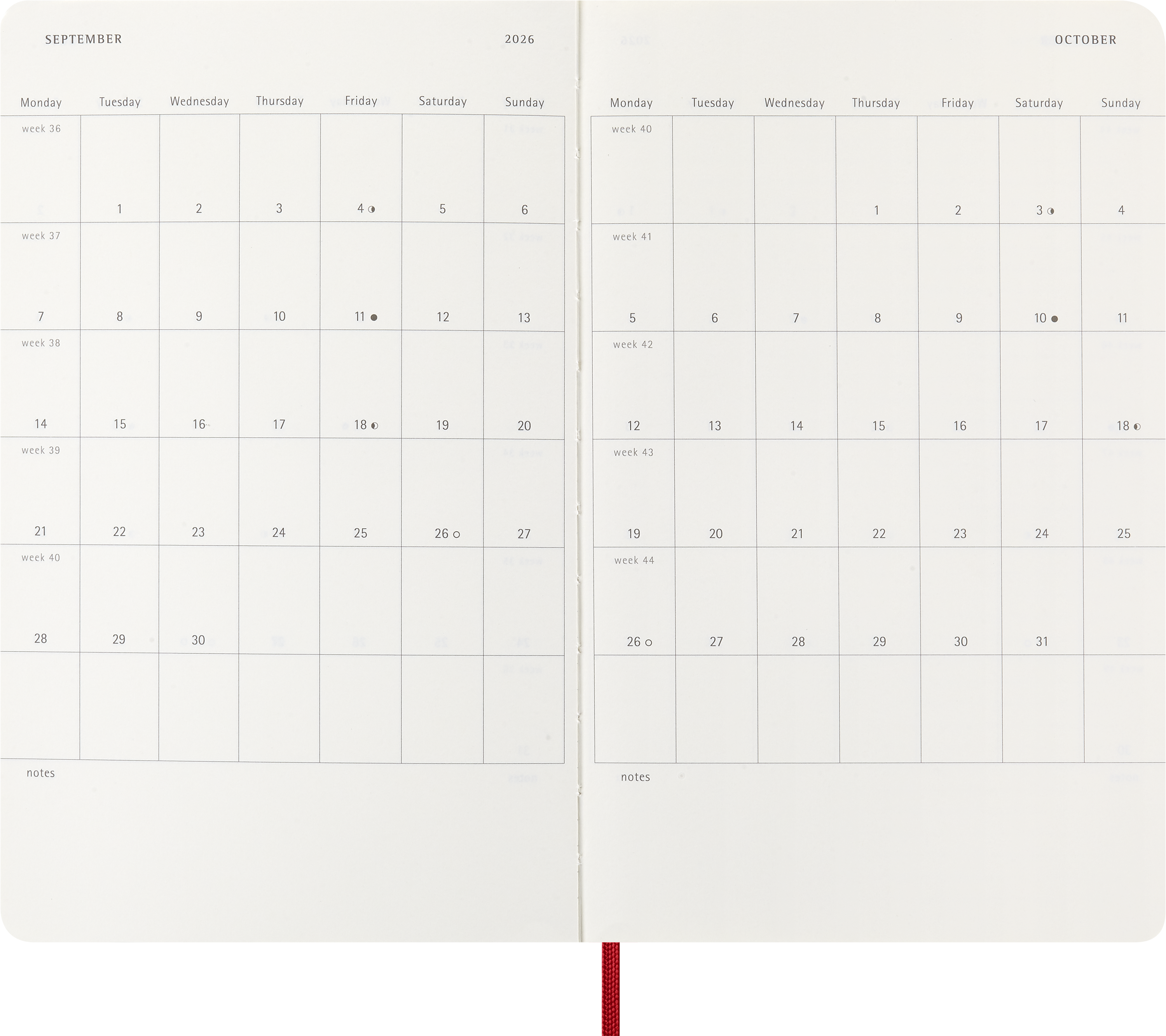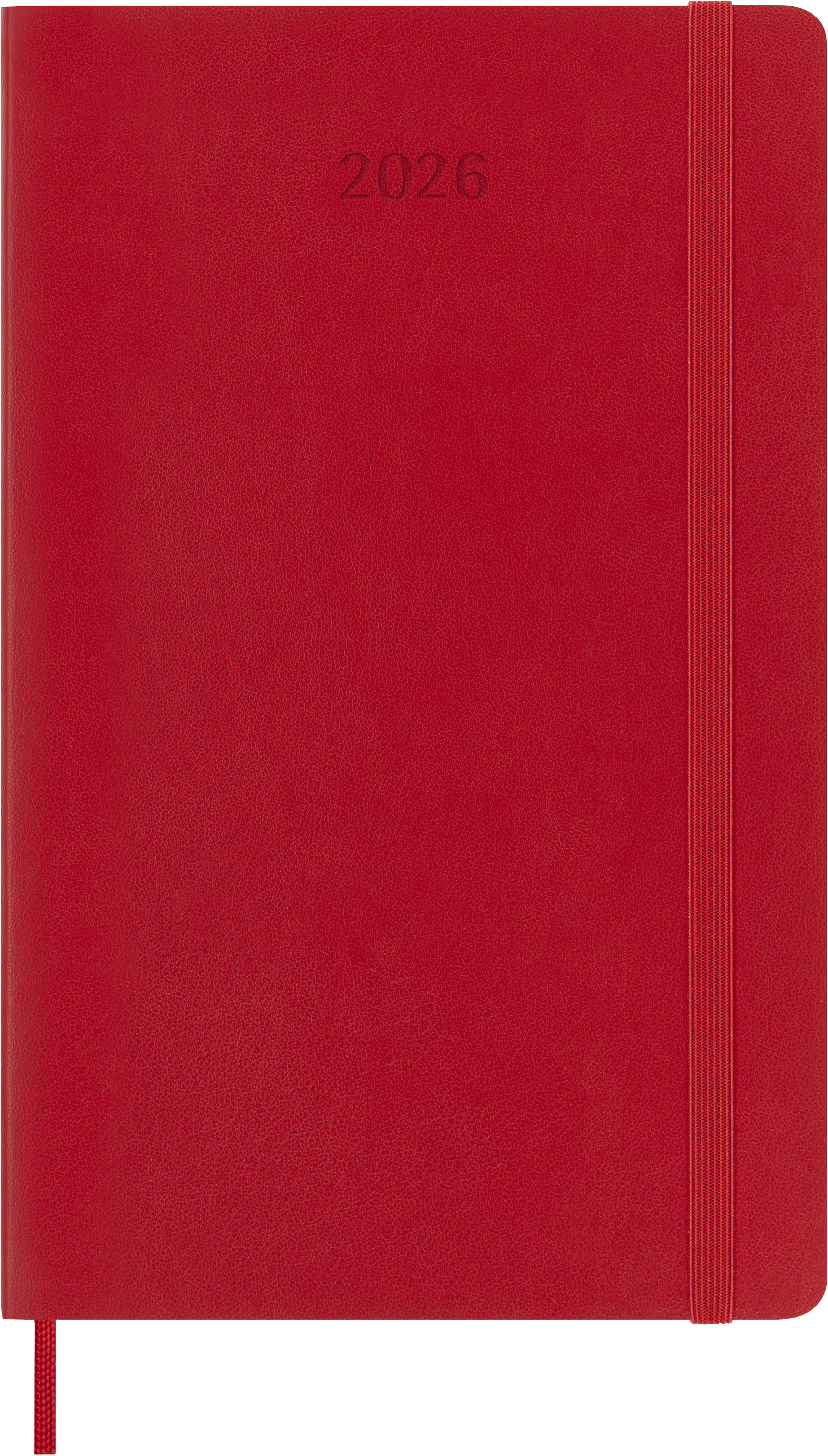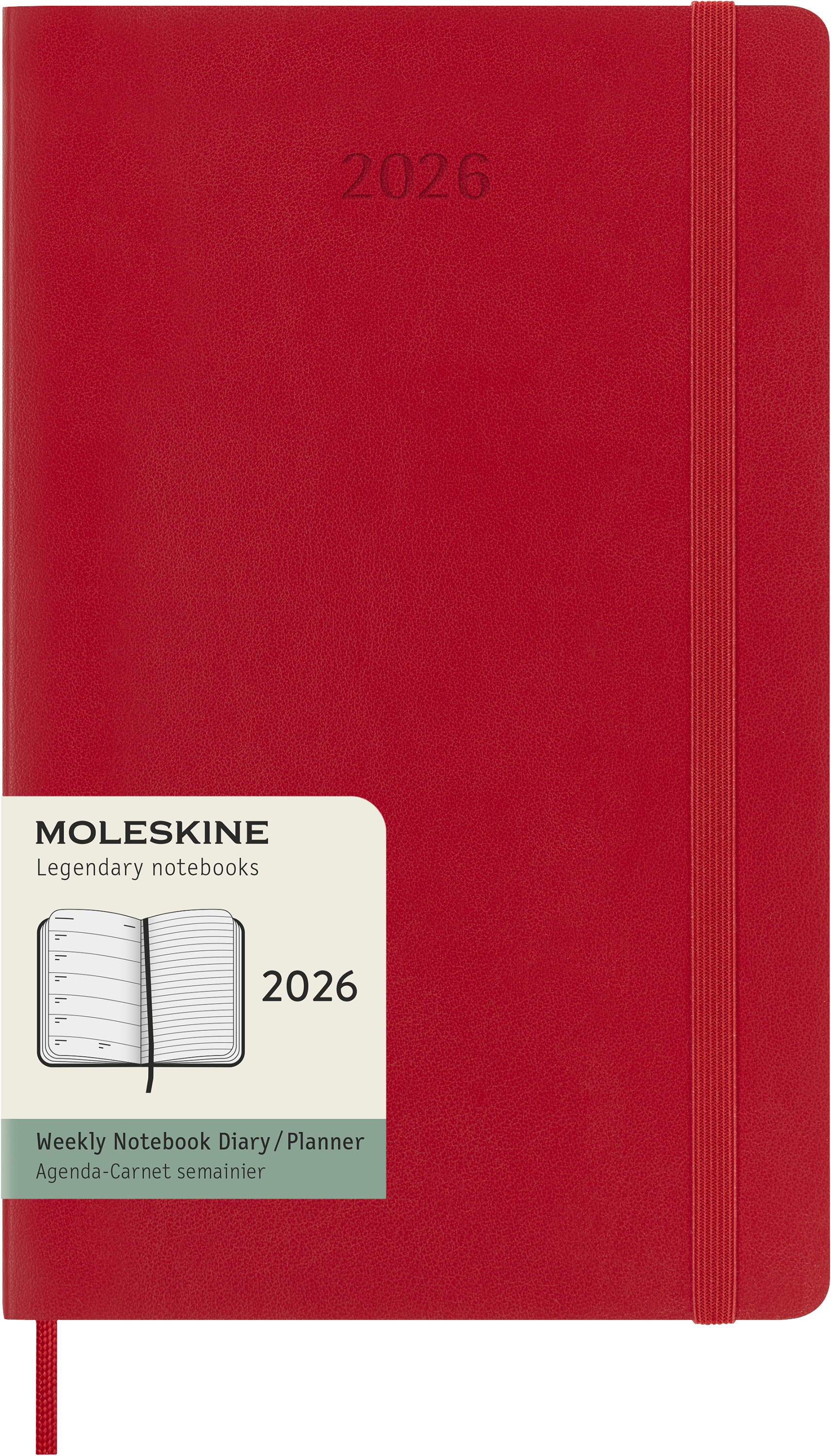 Moleskine 2026 uge pr side + notes kalender i Large (A5+) størrelse med softcover i Rød. Kalenderen dækker 12 måneder Januar til December, og giver dig et struktureret overblik over hele året. Designet med Moleskines klassiske detaljer som elastiklukning,  runde hjørner, matchende bogmærkebånd, inderlomme til løse notater, stickers samt 70g elfenbensfarvet syrefrit papir, årsoversigt, månedsoversigt, hvilket gør den både praktisk og stilfuld. Perfekt til dig, der ønsker at holde styr på aftaler, deadlines og daglige noter med et professionelt og tidløst udtryk. En ideel kalender til både arbejde, studie og privat brug.