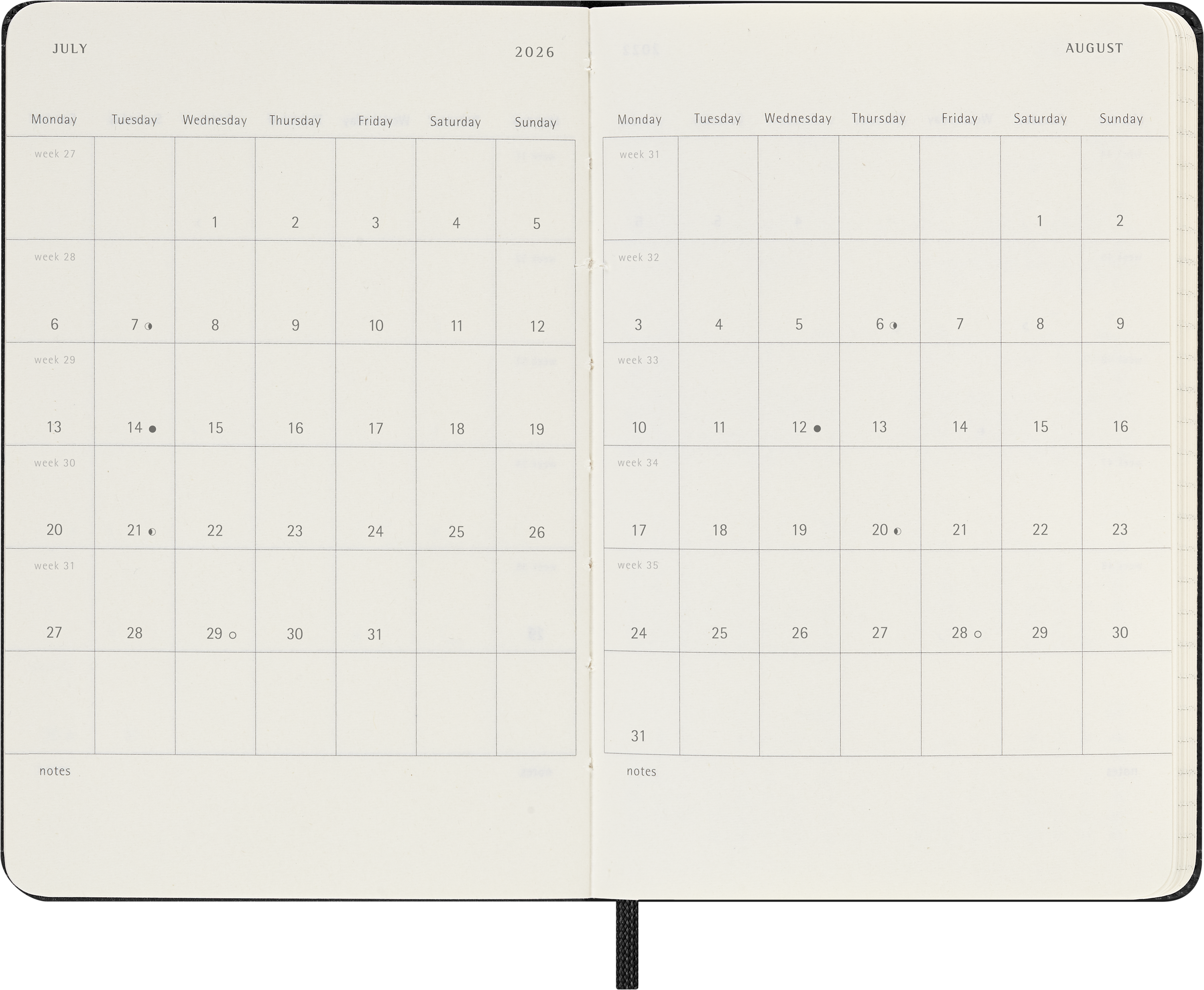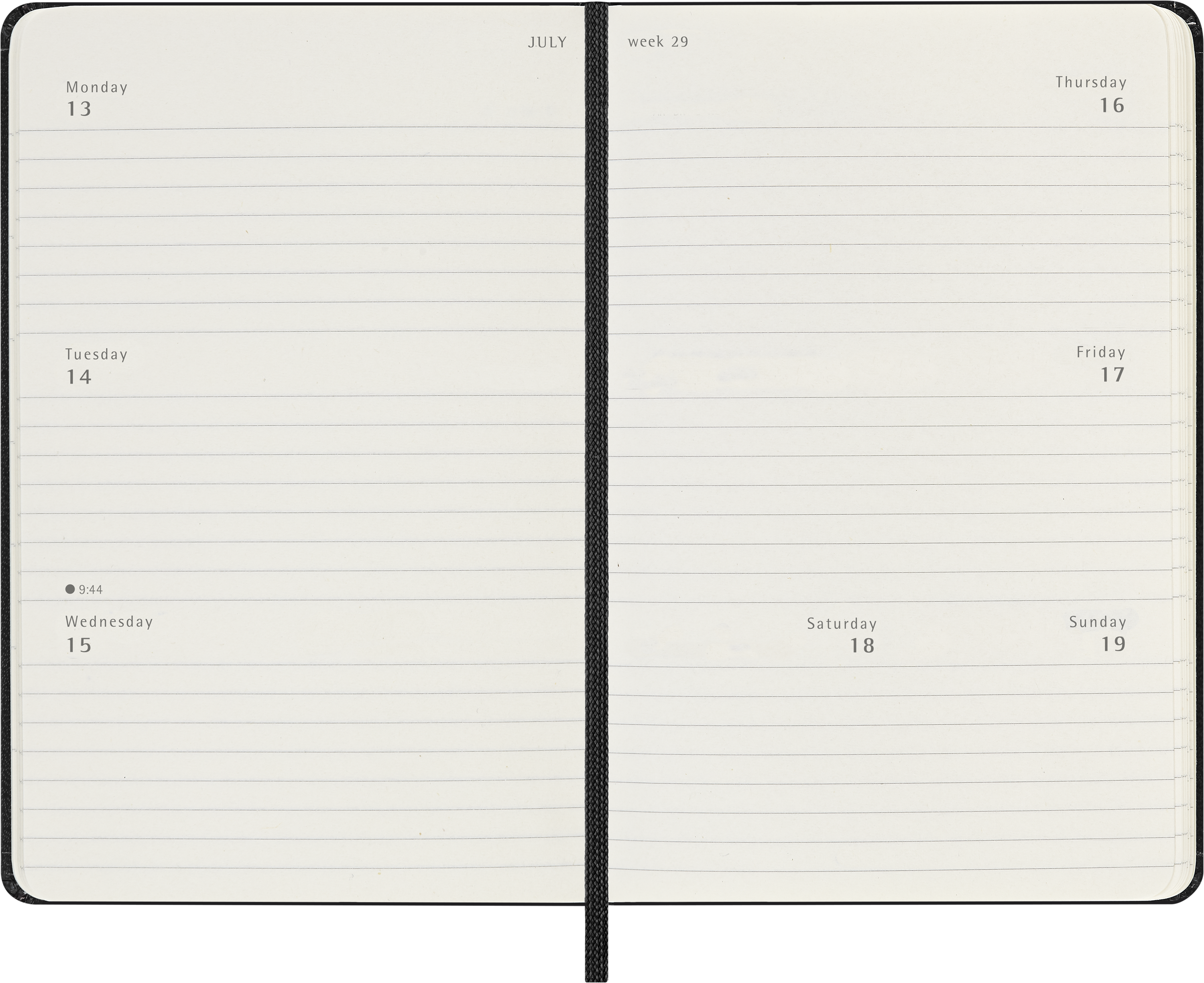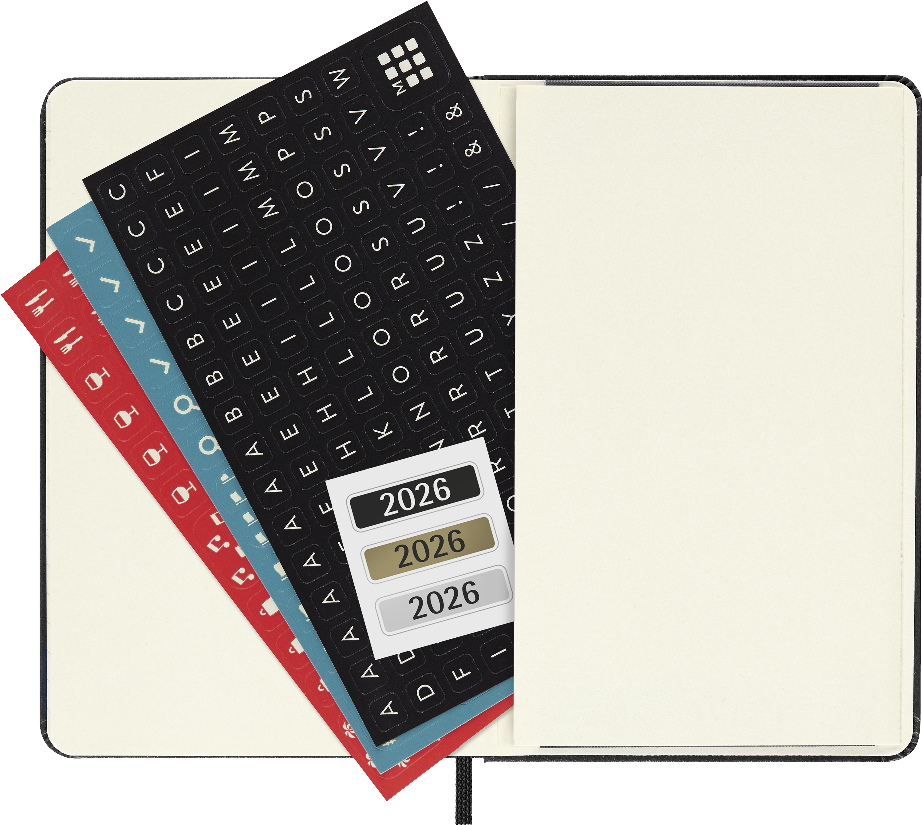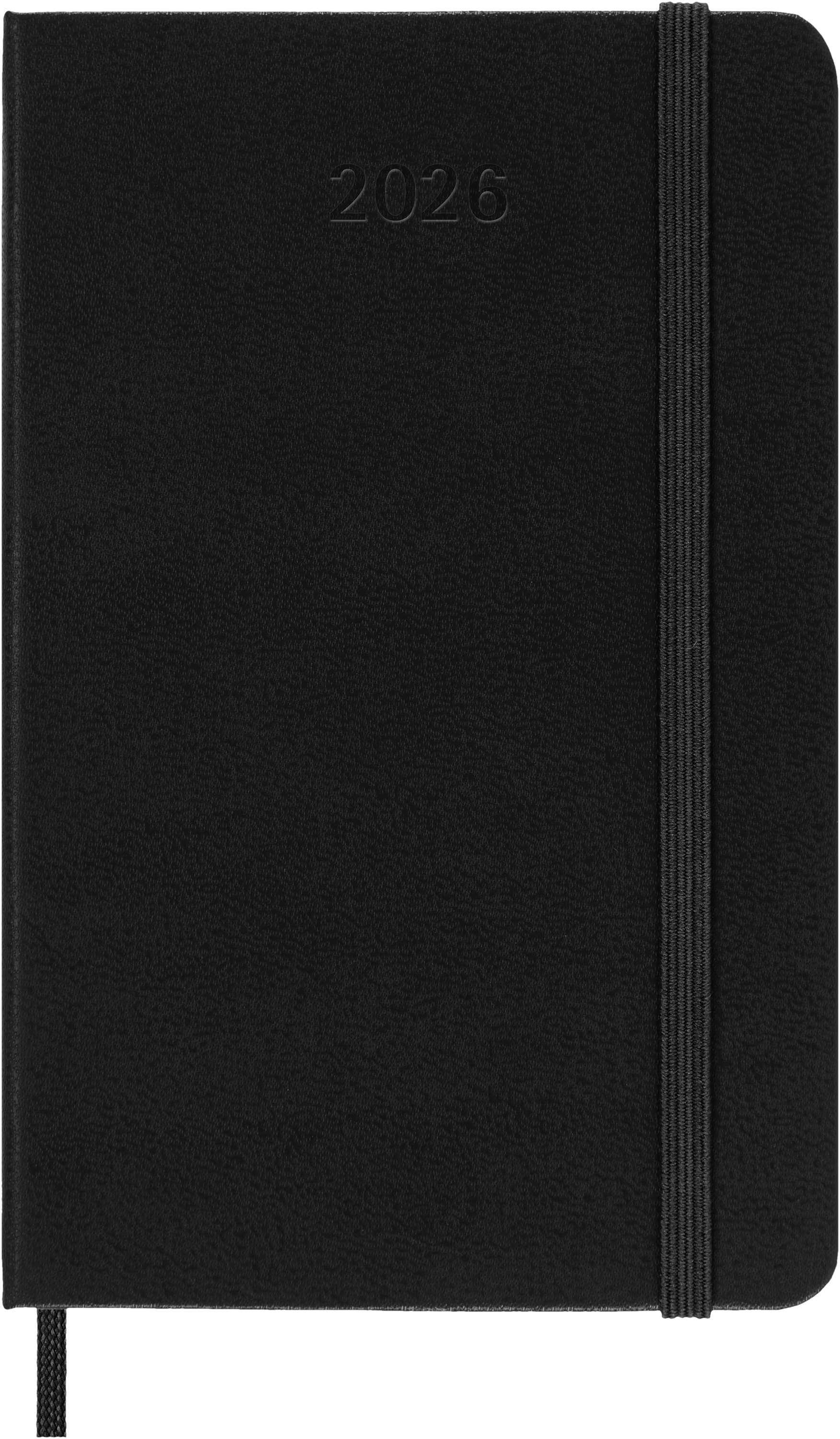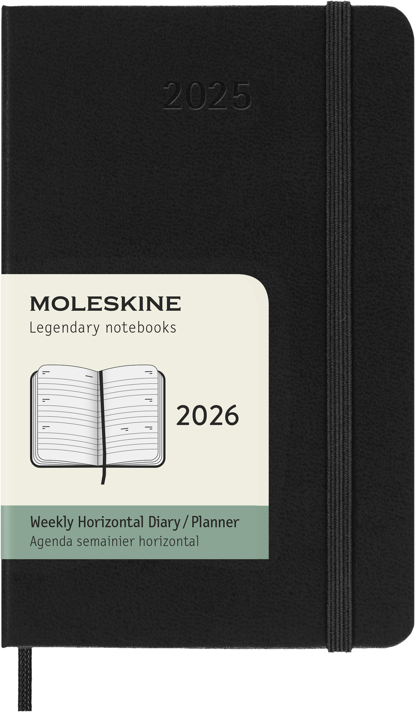 Moleskine 2026 uge pr opslag horisontalt kalender i Pocket (A6+) størrelse med hardcover i Sort. Kalenderen dækker 12 måneder Januar til December, og giver dig et struktureret overblik over hele året. Designet med Moleskines klassiske detaljer som elastiklukning, runde hjørner, matchende bogmærkebånd, inderlomme til løse notater, stickers samt 70g elfenbensfarvet syrefrit papir, årsoversigt, månedsoversigt, hvilket gør den både praktisk og stilfuld. Perfekt til dig, der ønsker at holde styr på aftaler, deadlines og daglige noter med et professionelt og tidløst udtryk. En ideel kalender til både arbejde, studie og privat brug.