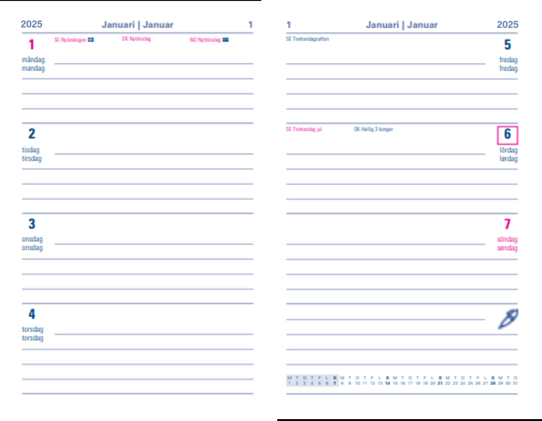 Letts 2026 Woodland Kalender A6 Ugeopslag Grøn fra Letts leverer et rent, tidløst udtryk – og en hverdag hvor det praktiske spiller smukt sammen med design. A6-formatet rammer den perfekte balance mellem skriveplads på kontoret og mobilitet på farten. Ugeopslaget giver et samlet overblik, hvor hverdage og weekend står side om side – perfekt til både arbejdstid og privatliv. Det bløde hardcover med silkeblød overflade ligger godt i hånden og tåler daglig brug. Siderne er trykt på 70 g/m² hvidt papir fra ansvarlige kilder; pennen flyder let, og indholdet forbliver skarpt uden gennemtryk. Syet indbinding, bogmærkesnor og rene typografiske linjer gør kalenderen til et trofast arbejdsredskab år efter år. Derudover får du Harcover indebundet med en rustik følelse, moderne farve, bogmærke. Kalenderen dækker 12 måneder januar til december, så du kan planlægge hele 2026 fra første dag. Farven grøn giver et klassisk, roligt look, der passer ind i enhver professionel kontekst. Alt i alt: et stilrent værktøj, der gør det nemt at sætte kurs og holde tempo. Uanset om den bor på skrivebordet, i tasken eller i inderlommen, skaber den en rolig ramme om både arbejdsdage, studieliv og privat planer. Noter møder, træning, ferier og mål – og vend tilbage til et layout, der gør det let at prioritere. Detaljer som helligdagsmarkeringer, plads til noter og en frem- og tilbageplanlægger gør hverdagen mere overskuelig. Papiret arbejder godt med kuglepen, blyant og fineliner, og siderne bladrer let uden at krølle.